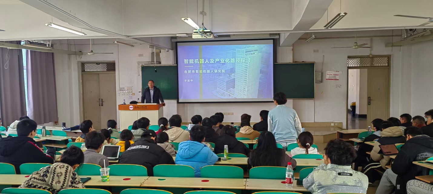 为进一步推进产教融合,帮助本科生深入了解智能机器人前沿技术及其应用场景,2025年12月8日上午,信息与通信系邀请合肥市智能机器人研究院于振中研究员,在翡翠湖校区翠五教208教室为我院2024级通信工程专业的本科生带来了一场题为《智能机器人及产业化路径探讨》的产业课程。