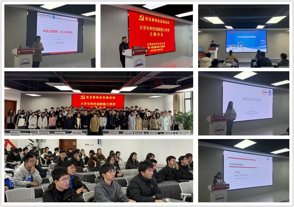 为帮助大学新生尽早投身科技创新实践,促进党建与业务工作深度融合,充分发挥基层党组织在人才培养中的主体作用,2025年12月19日,计算机科学与技术系第一与第二党支部以“大学生科技创新能力培养”主题讲座的形式,面向2025级计算机科学与技术专业新生联合开展了一次党支部特色实践活动。自2018年以来,该项活动已持续面向合肥和宣城校区共计八届计算机类专业新生开展。