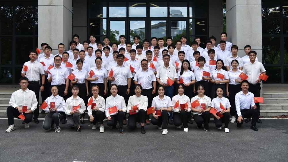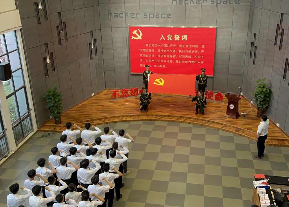 全体与会领导为新发展党员发放了党章和党徽。张海林带领新发展党员面向鲜红的中国共产党党旗庄严宣誓。